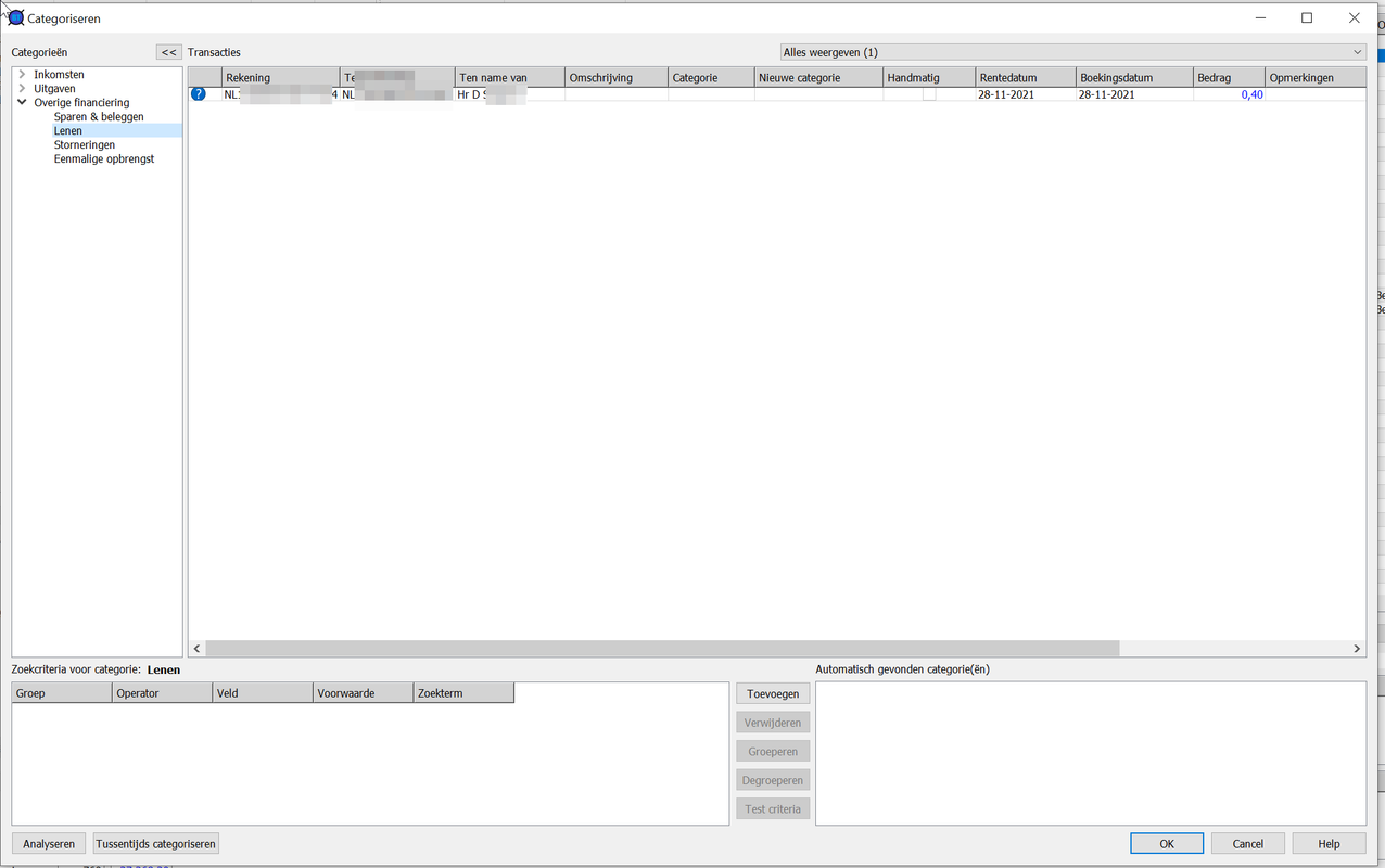 Zeker omdat elke combinatie van En/Of tot een nieuwe inspringing van de Groep leidt, wordt het snel onoverzichtelijk wat je aan het doen bent. Aangezien BankTrans al weet wat mijn eigen rekening zijn dacht ik dat er misschien wel een feature bestond waar ik (als nieuwe gebruiker) geen weet van had die transacties tussen eigen rekeningen automatisch kan herkennen.